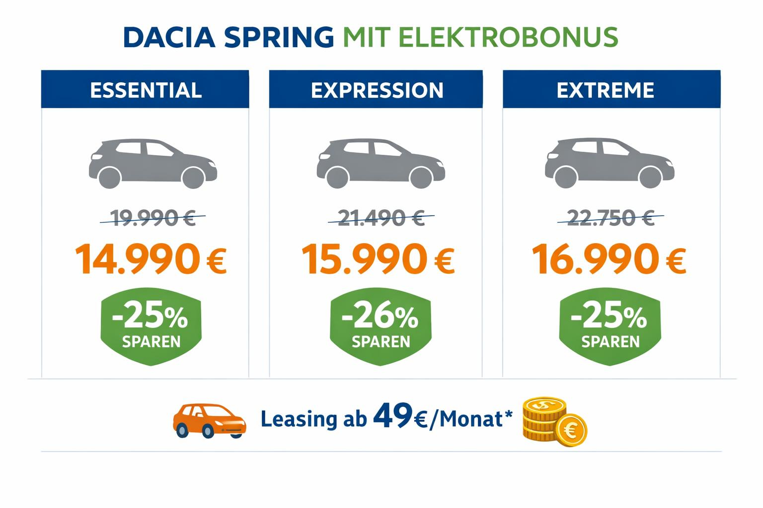 Der Dacia Elektrobonus beträgt 5.000 Euro (brutto). Er wird direkt vom Fahrzeugpreis abgezogen und gilt für alle Spring-Ausstattungsvarianten.